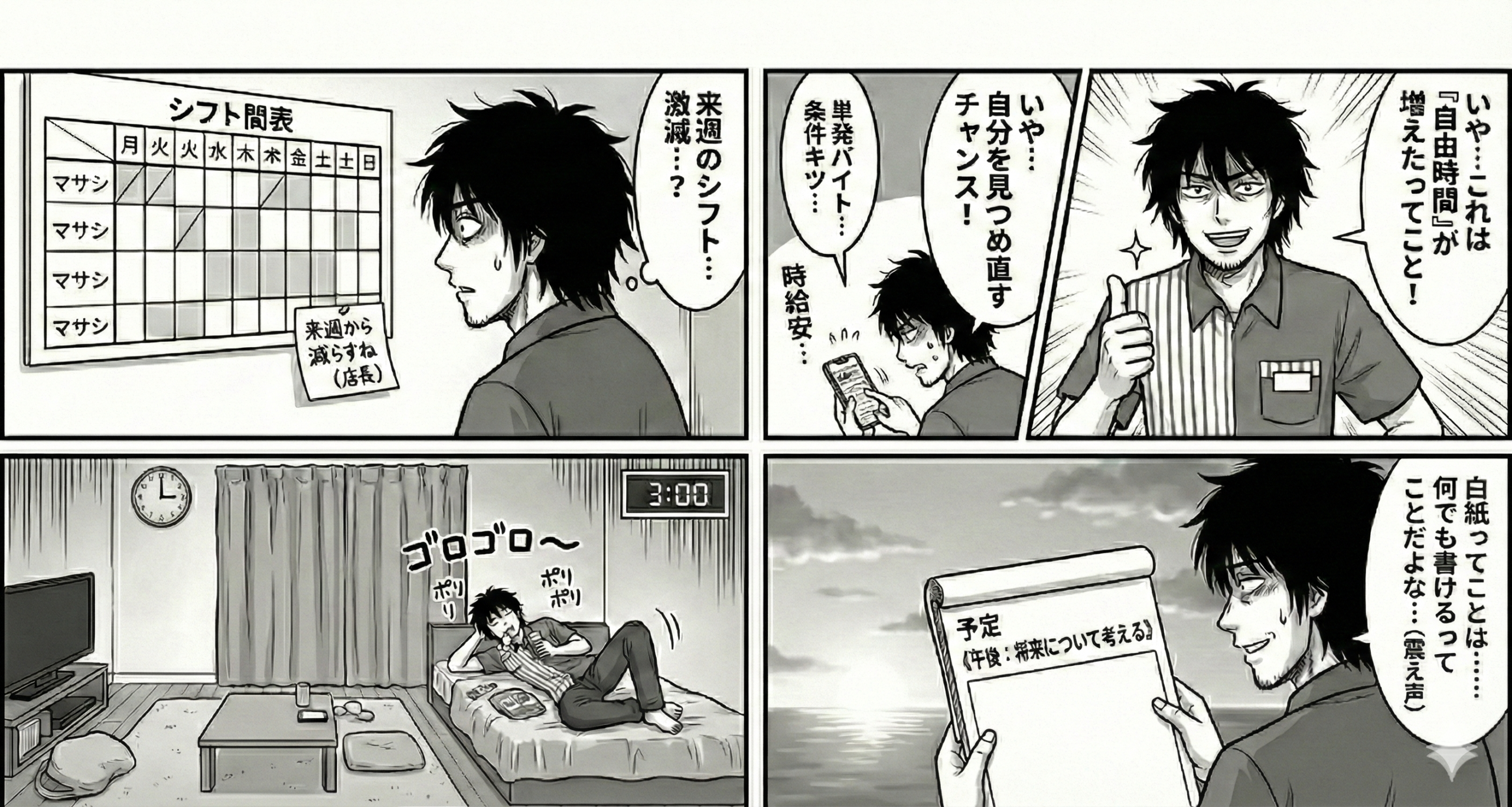 壁に貼られたシフト表の前で、マサシはじっと立ち尽くしていた。
