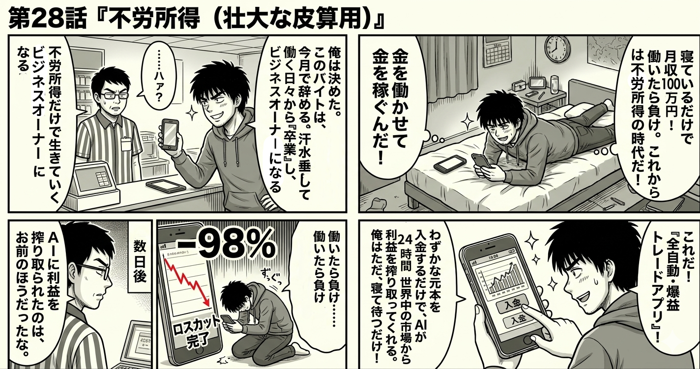 「俺はこれまで、自分の時間を切り売りして小銭を稼ぐという、非効率極まりない生き方をしていた……。だが違う。本当の勝ち組は、金に働かせる側だ!」