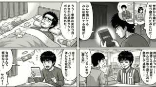 オリジナルWeb漫画:フリーター奮闘記シリーズ 第10話季節の変わり目。昼と夜の気温差が大きくなった頃、マサシは突然の高熱でダウンしてしまった。ワンルームの部屋のベッド。額には冷えピタ。体温計は38度台を示している。「うぅ……季節の変わり目...